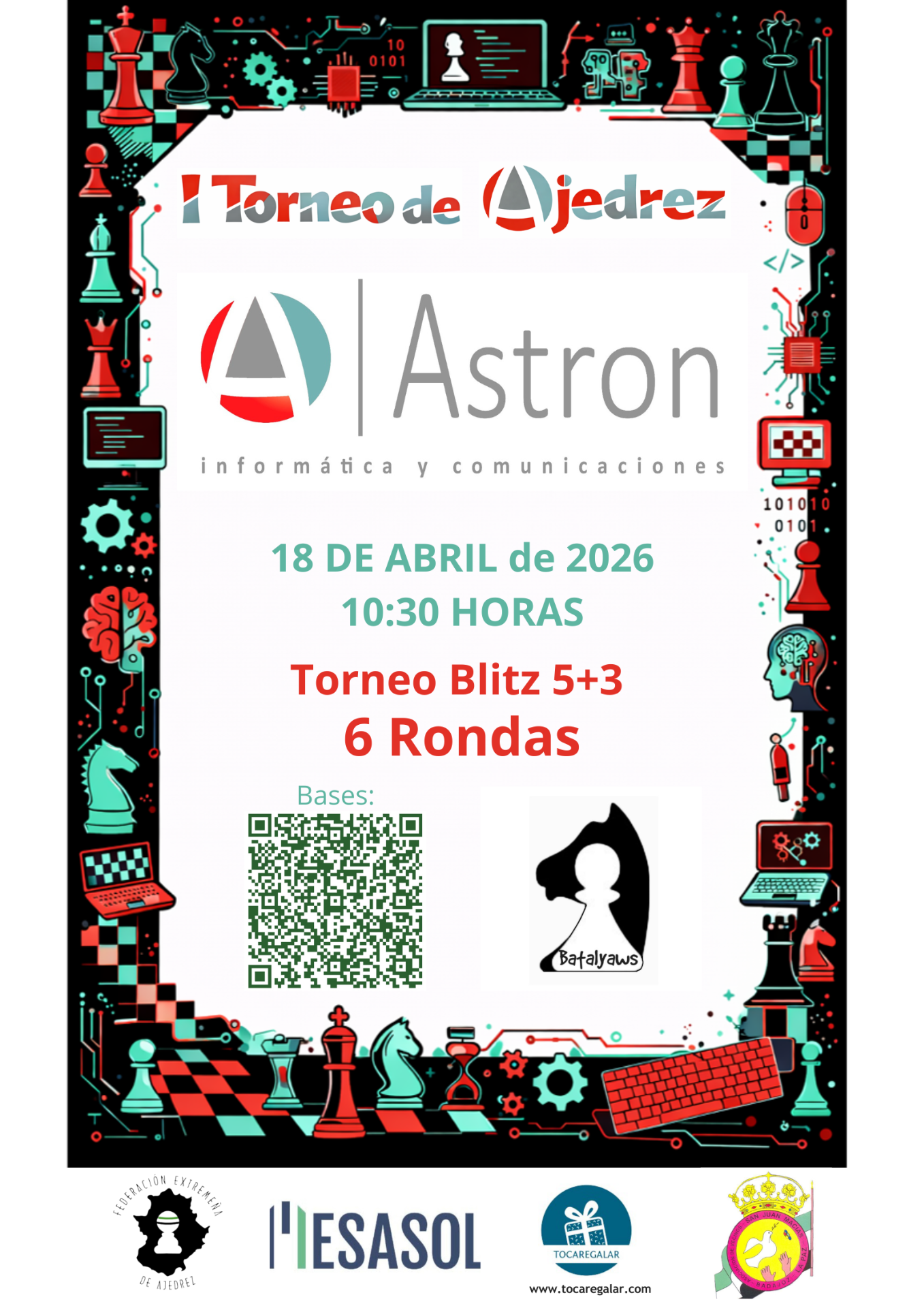 El próximo sábado 18 de abril celebraremos el Primer torneo de Ajedrez Astron, en colaboración con nuestro patrocinador principal, ASTRON Informática. Un torneo que esperamos sea un punto de unión para todos los aficionados al ajedrez. Esta es una más de las muchas actividades que el club desarrolla en este año 2026 lleno de ajedrez. En esta ocasión el torneo se llevará a cabo en las instalaciones de la Asociación de Vecinos de La Paz, a la que agradecemos su implicación y su apuesta por el ajedrez. Descarga las bases en el enlace tras el cartel.